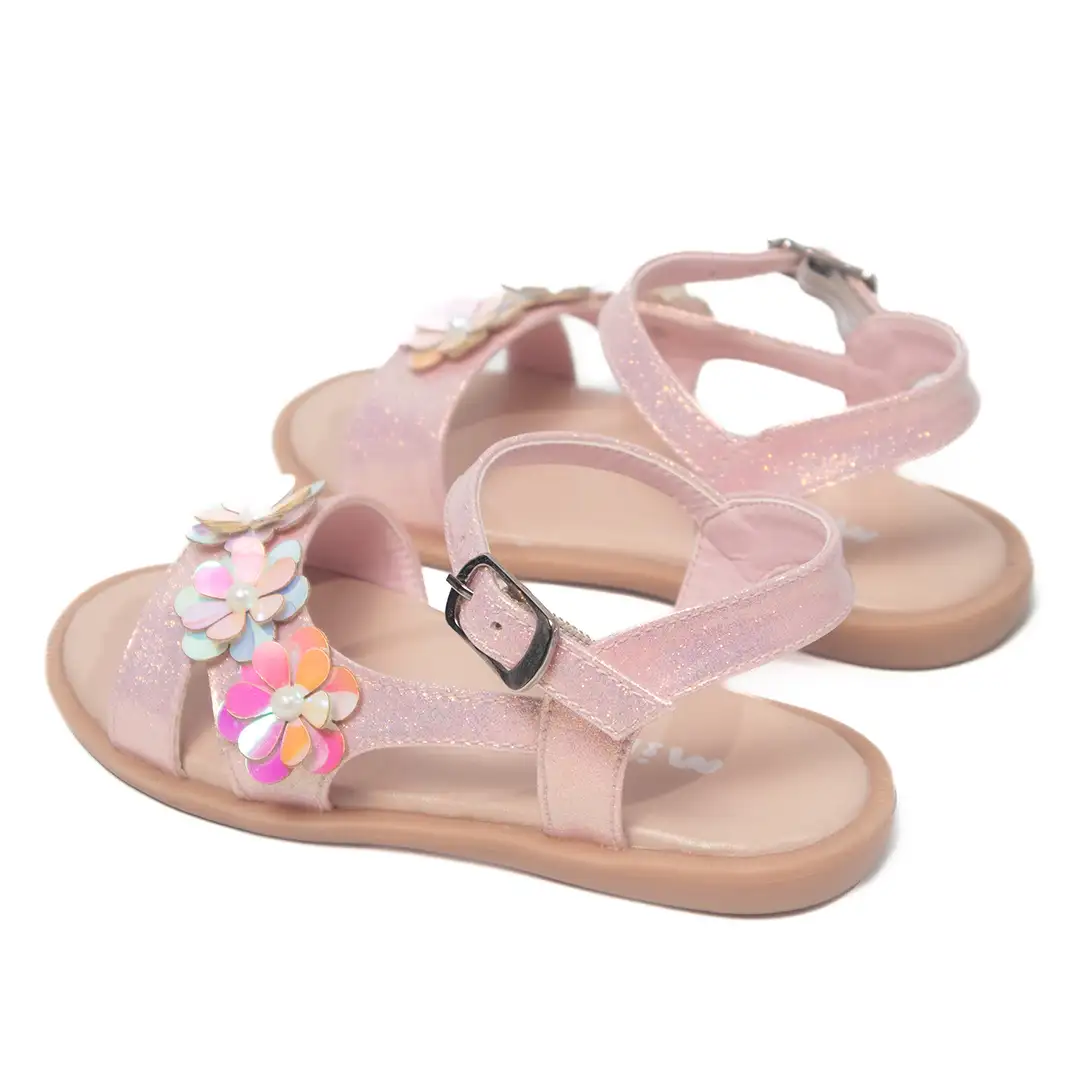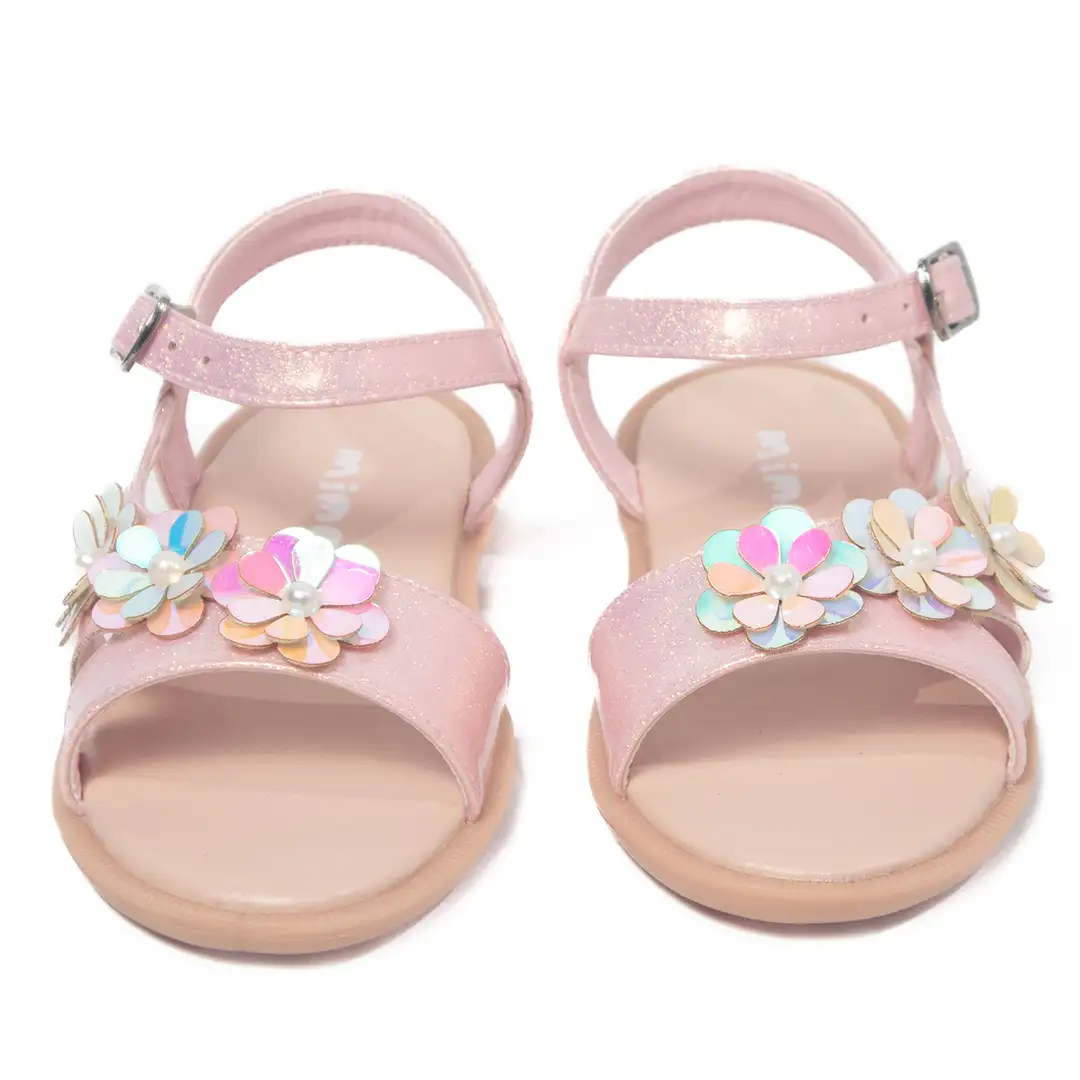 Estas sandalias rosadas brillantes combinan estilo y encanto con un diseño único adornado con flores multicolores de acabado iridiscente y detalle central de perlas