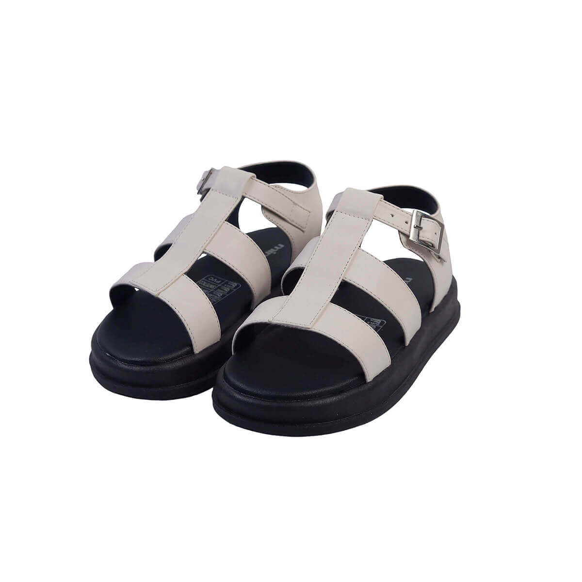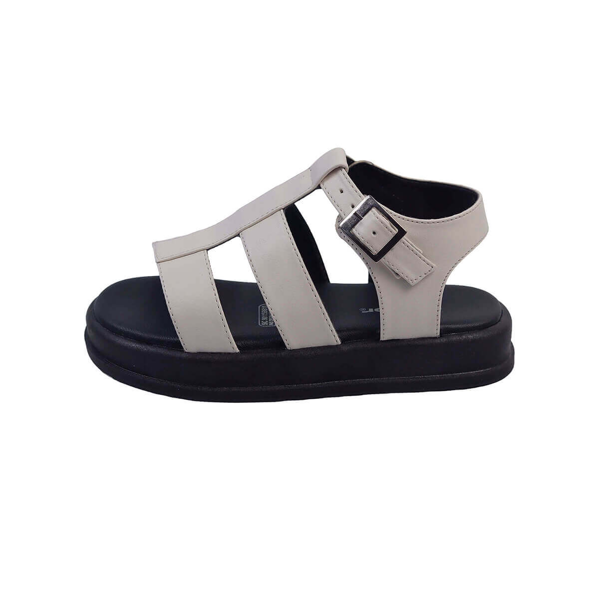 Sandalias de diseño moderno y versátil, confeccionadas en una combinación de materiales que destacan por su durabilidad y estilo. El empeine está compuesto por tiras anchas en color beige claro, dispuestas de forma estratégica para proporcionar soporte y comodidad, además de incluir una correa ajustable con hebilla metálica lateral que asegura un ajuste preciso. La suela, de color negro y estilo plataforma, ofrece una base robusta y amortiguada, ideal para un uso prolongado. Su diseño abierto con una tira central alargada brinda una estética minimalista, perfecta para combinar con diversos atuendos casuales. Estas sandalias son una opción funcional y elegante para el día a día.