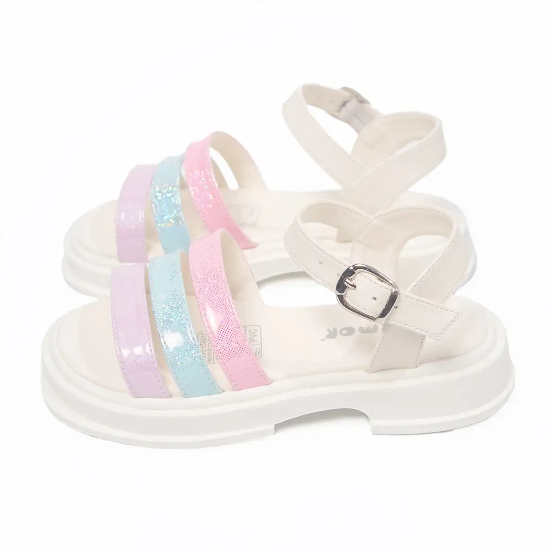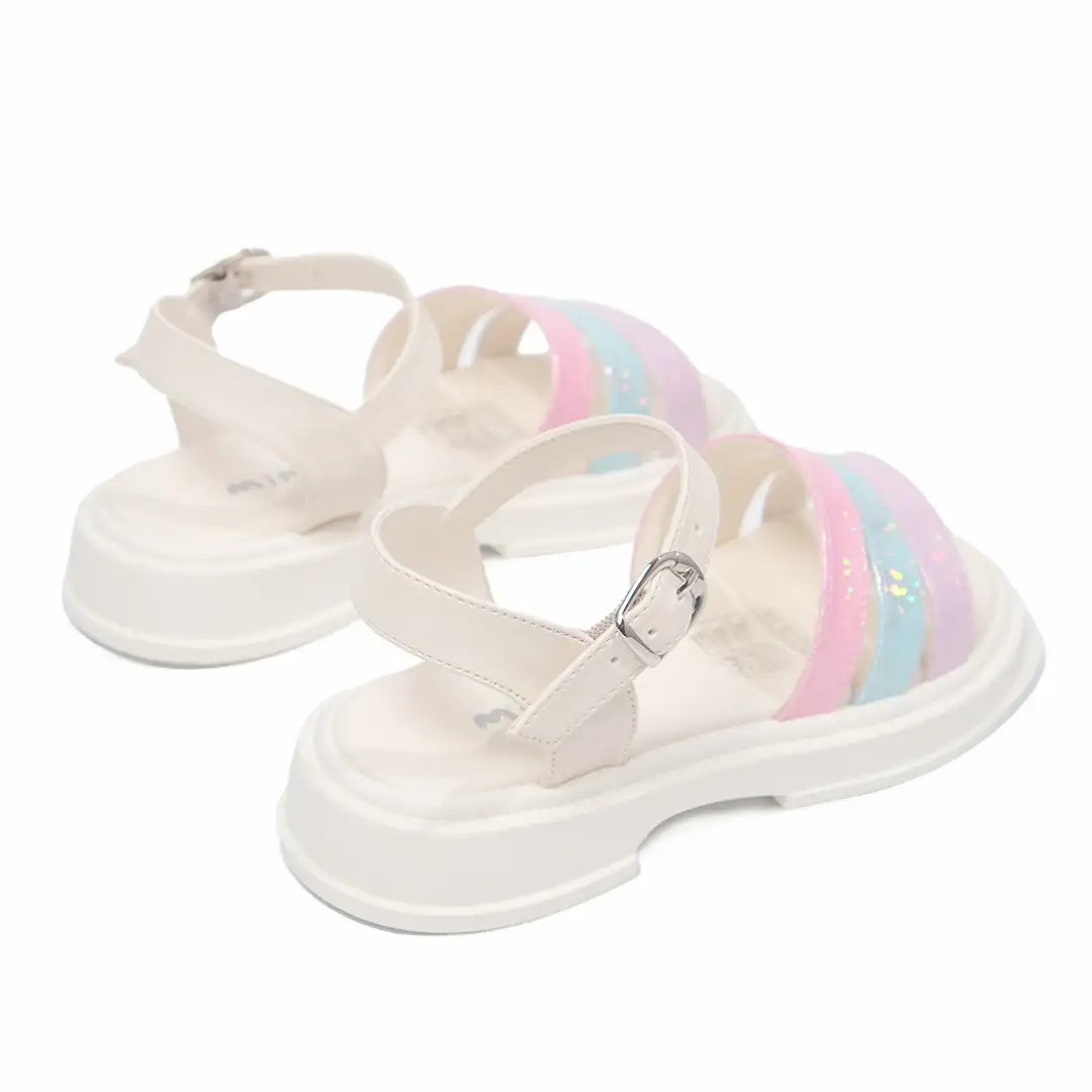 Sandalias infantiles de estilo alegre y llamativo, diseñadas con tiras decorativas en tonos pastel (rosado, azul y lila) con acabado brillante y detalles de glitter que aportan un toque divertido