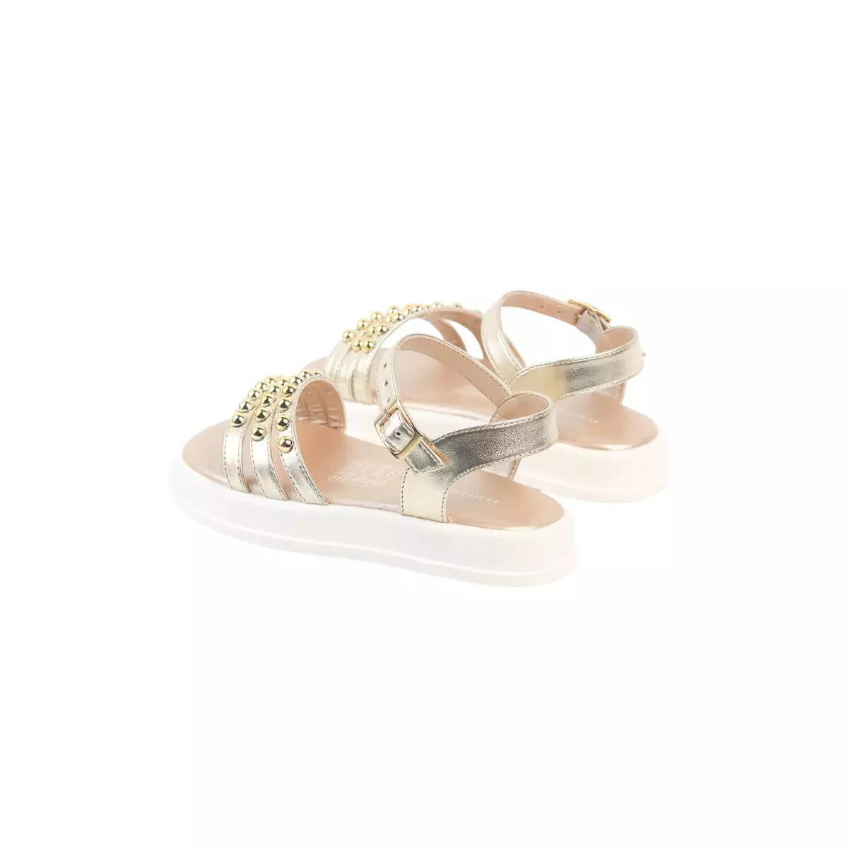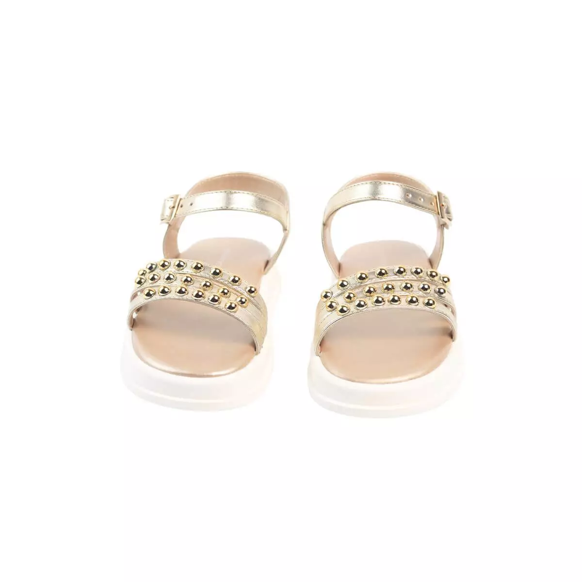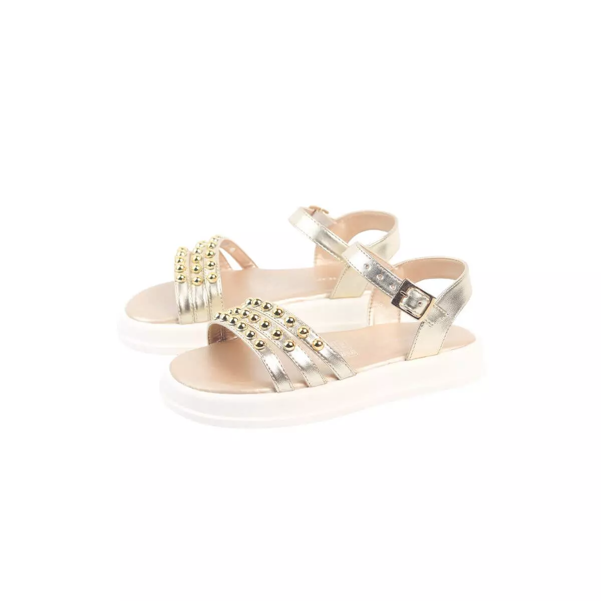 Sandalias para niña en un sofisticado tono dorado metálico con diseño moderno y llamativo. Presentan tiras frontales decoradas con apliques de tachuelas doradas, añadiendo un estilo audaz y elegante. Cuentan con una correa ajustable con hebilla metálica para un ajuste seguro y una suela blanca elevada que proporciona comodidad y un toque contemporáneo. Ideales para complementar atuendos casuales o de fiesta, estas sandalias combinan practicidad y un diseño chic, perfectas para destacar en cualquier ocasión especial.