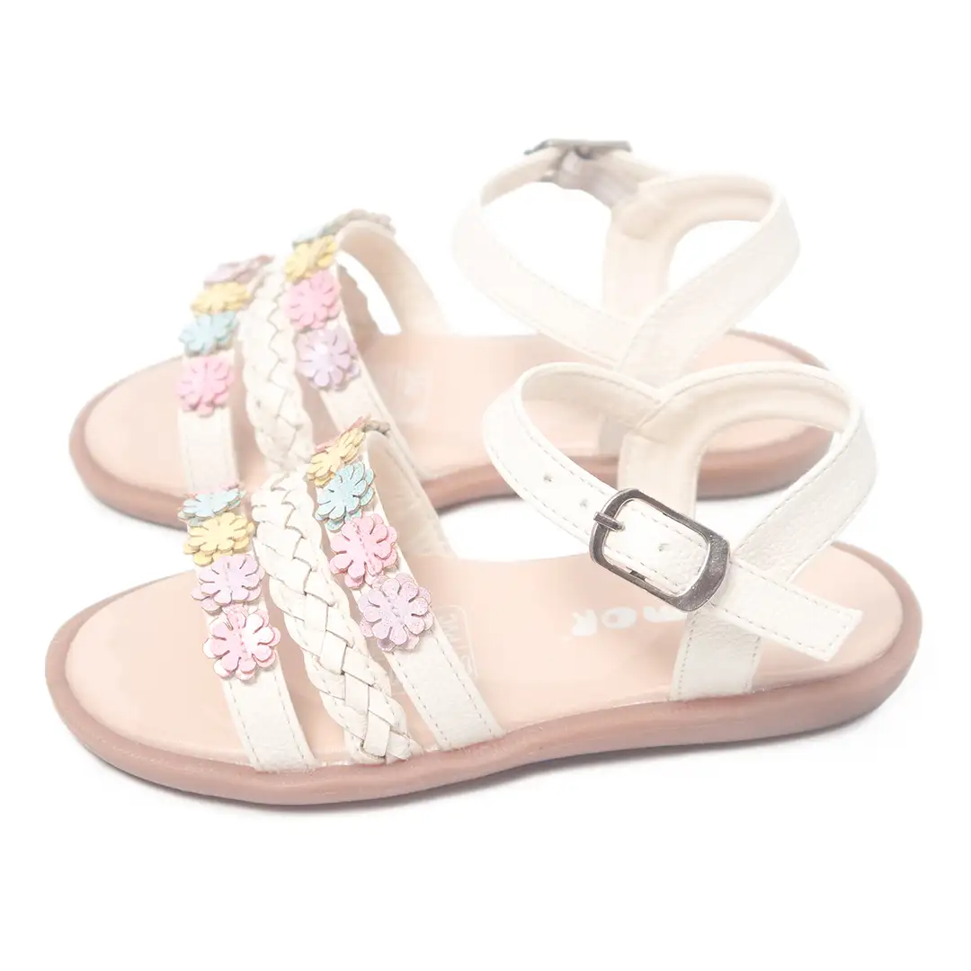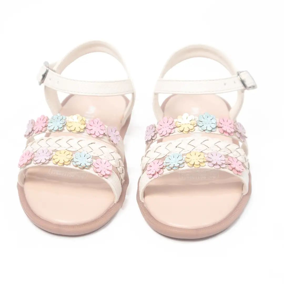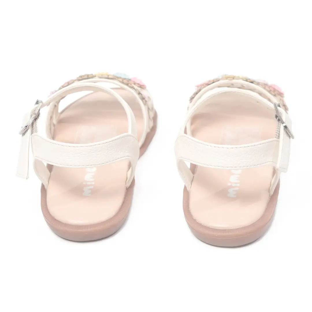 Sandalias para niña en color talco con detalles decorativos multicolores