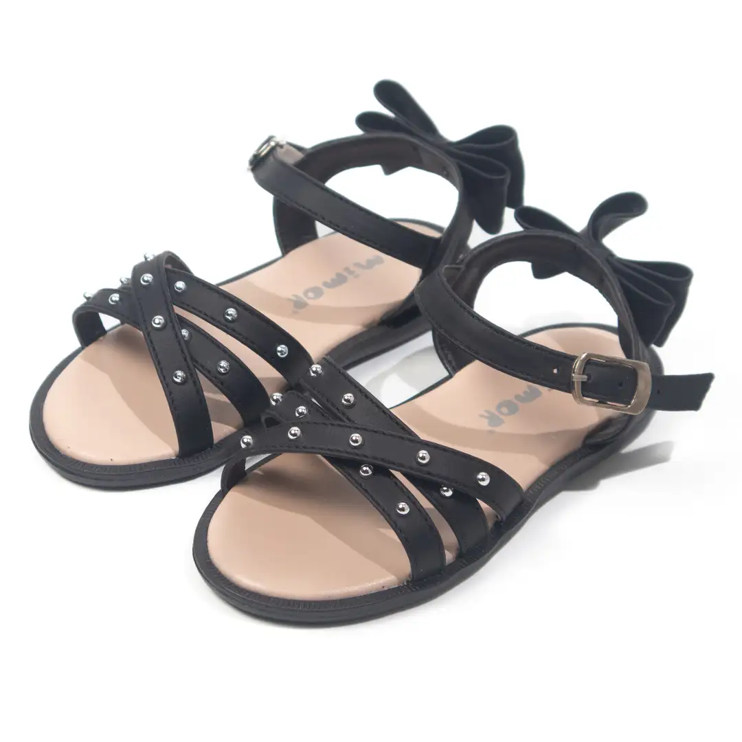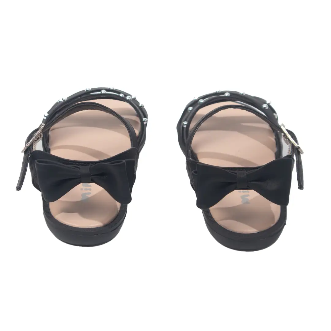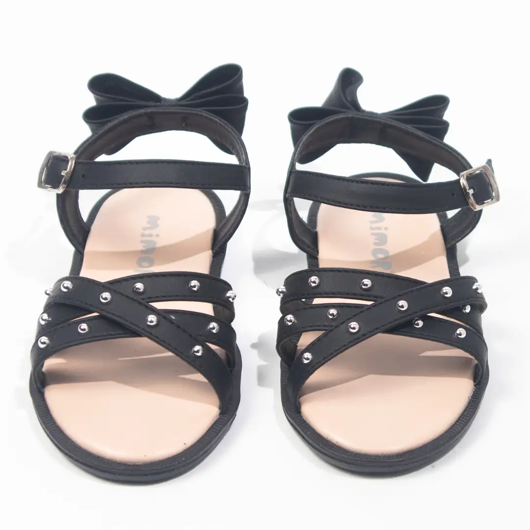 Diseño cruzado decorado con pequeños apliques metálicos en las correas delanteras, que aportan un toque moderno y elegante. Incluyen un lazo voluminoso en la parte trasera, que añade un estilo encantador y distintivo. La correa ajustable con hebilla permite un ajuste seguro y cómodo, mientras que la suela antideslizante en tono neutro proporciona estabilidad. Perfectas para eventos especiales o combinaciones casuales con un toque sofisticado.