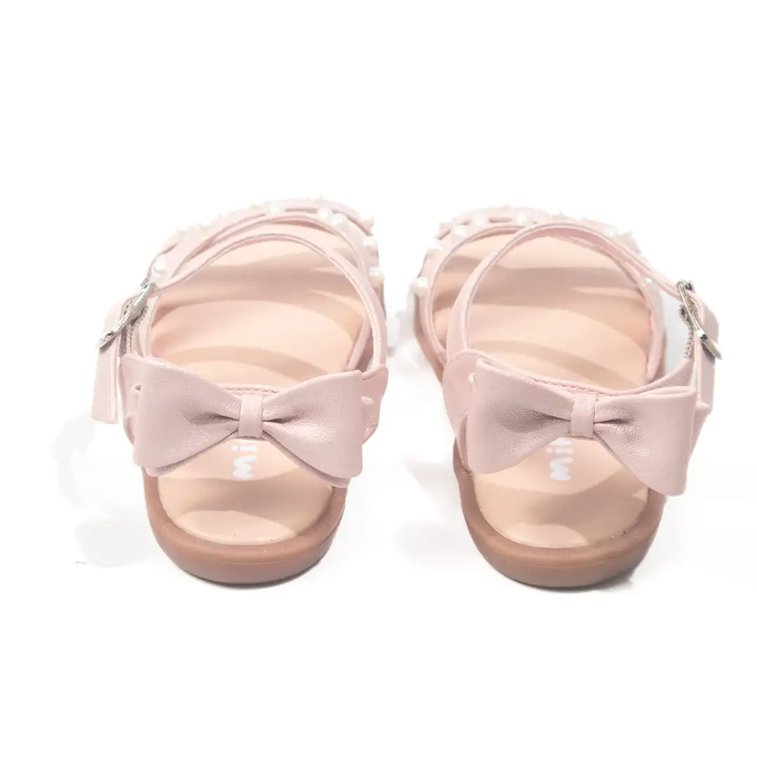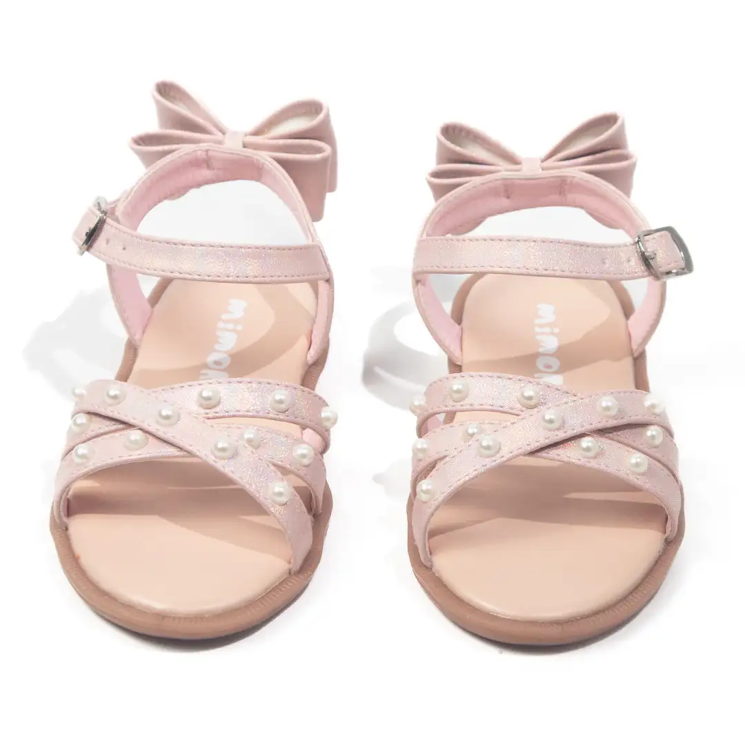 Sandalias para niña en color rosa pastel, con diseño cruzado en la parte delantera decorado con delicadas perlas que aportan un toque sofisticado y femenino. Incluyen un lazo en la parte trasera, complementando el diseño con un estilo encantador. La correa ajustable con hebilla asegura un ajuste cómodo y seguro, mientras que la suela antideslizante brinda estabilidad y confort. Ideales para eventos especiales o para añadir un toque elegante a looks casuales.