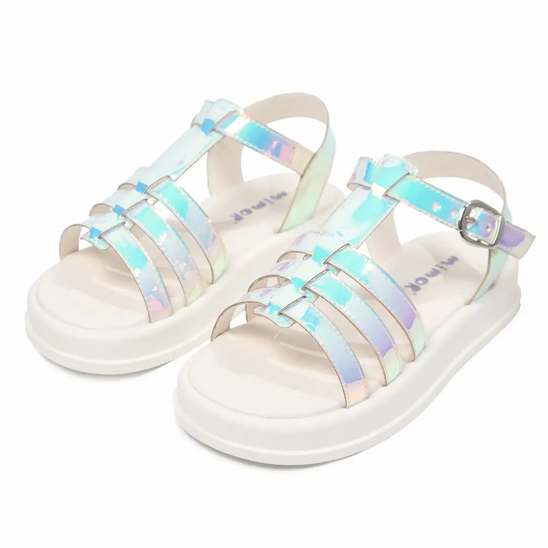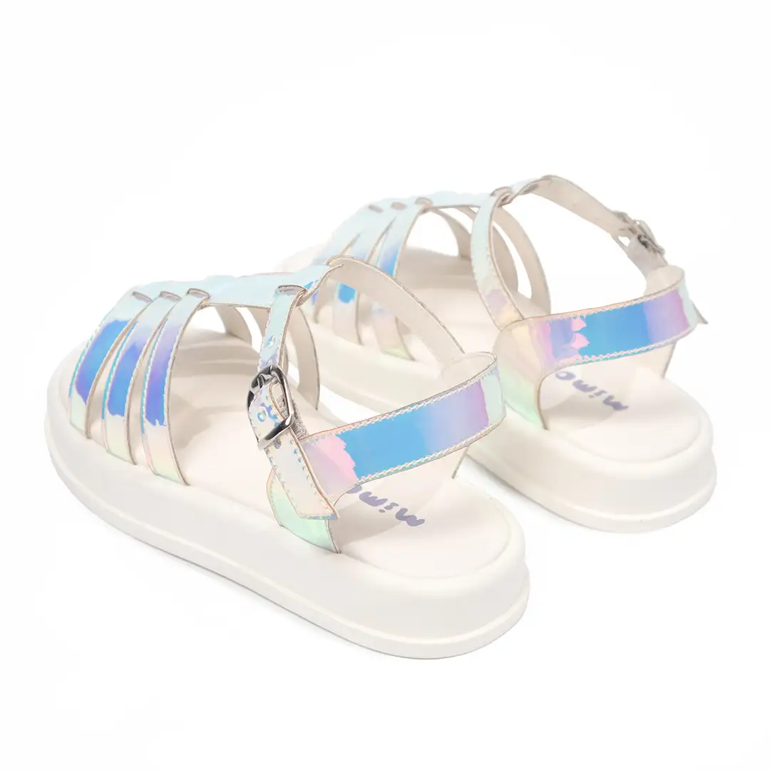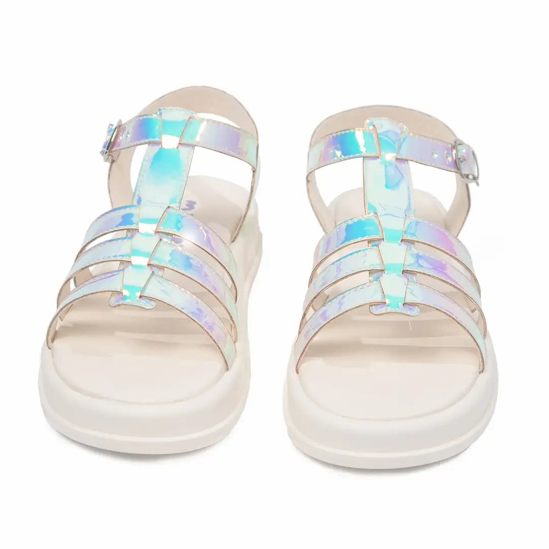 Estas sandalias para niñas tienen un diseño tipo gladiador con múltiples correas delgadas distribuidas en el empeine y unidas a una correa central. Están elaboradas en material sintético con acabado iridiscente que refleja tonos azulados, rosados y plateados dependiendo de la luz, creando un efecto brillante y llamativo. La suela es plana y de color blanco, fabricada con un material acolchado para mayor comodidad. Incorporan un cierre ajustable con hebilla metálica en el tobillo para un ajuste seguro. La combinación de líneas geométricas rectas y el efecto holográfico las hace visualmente modernas y dinámicas.