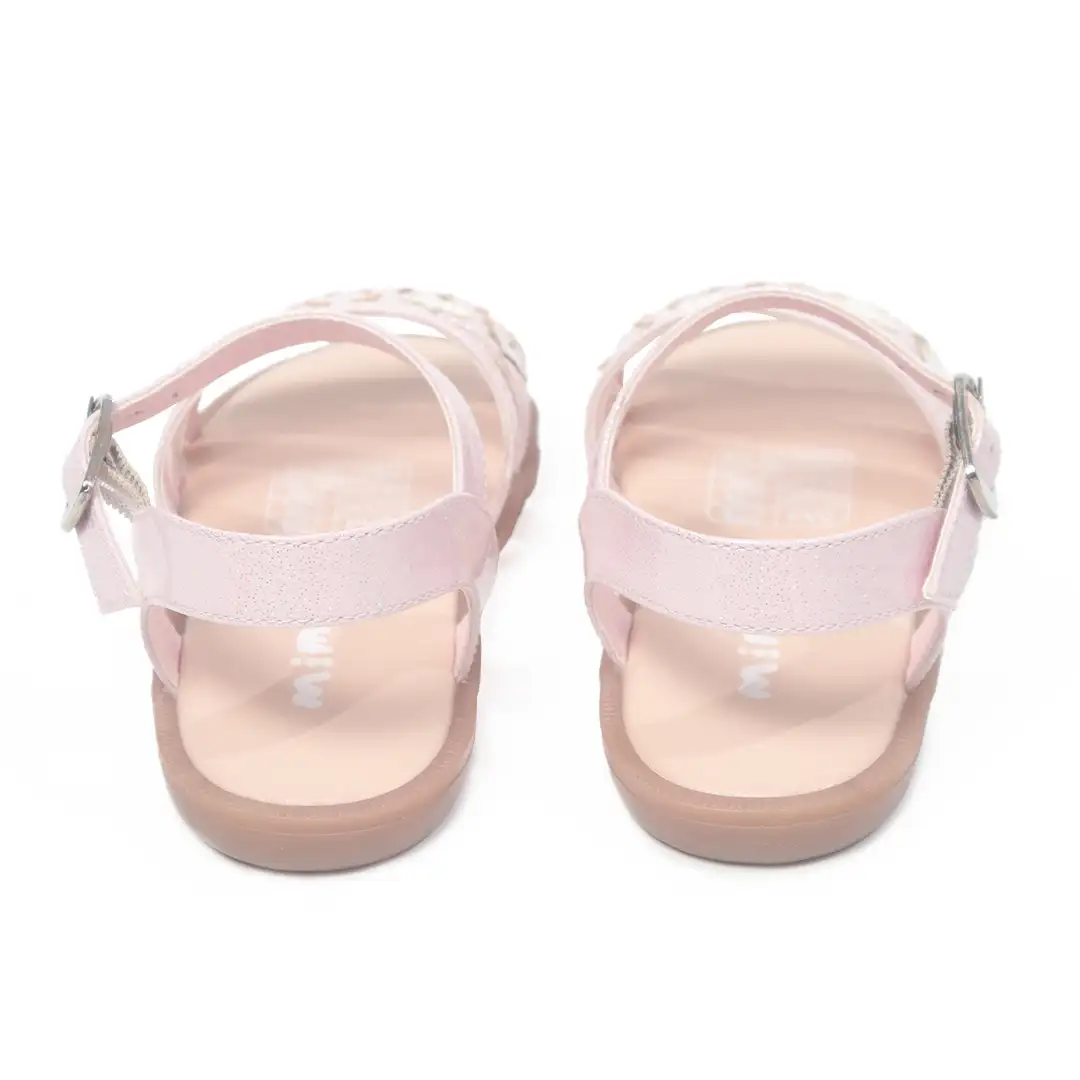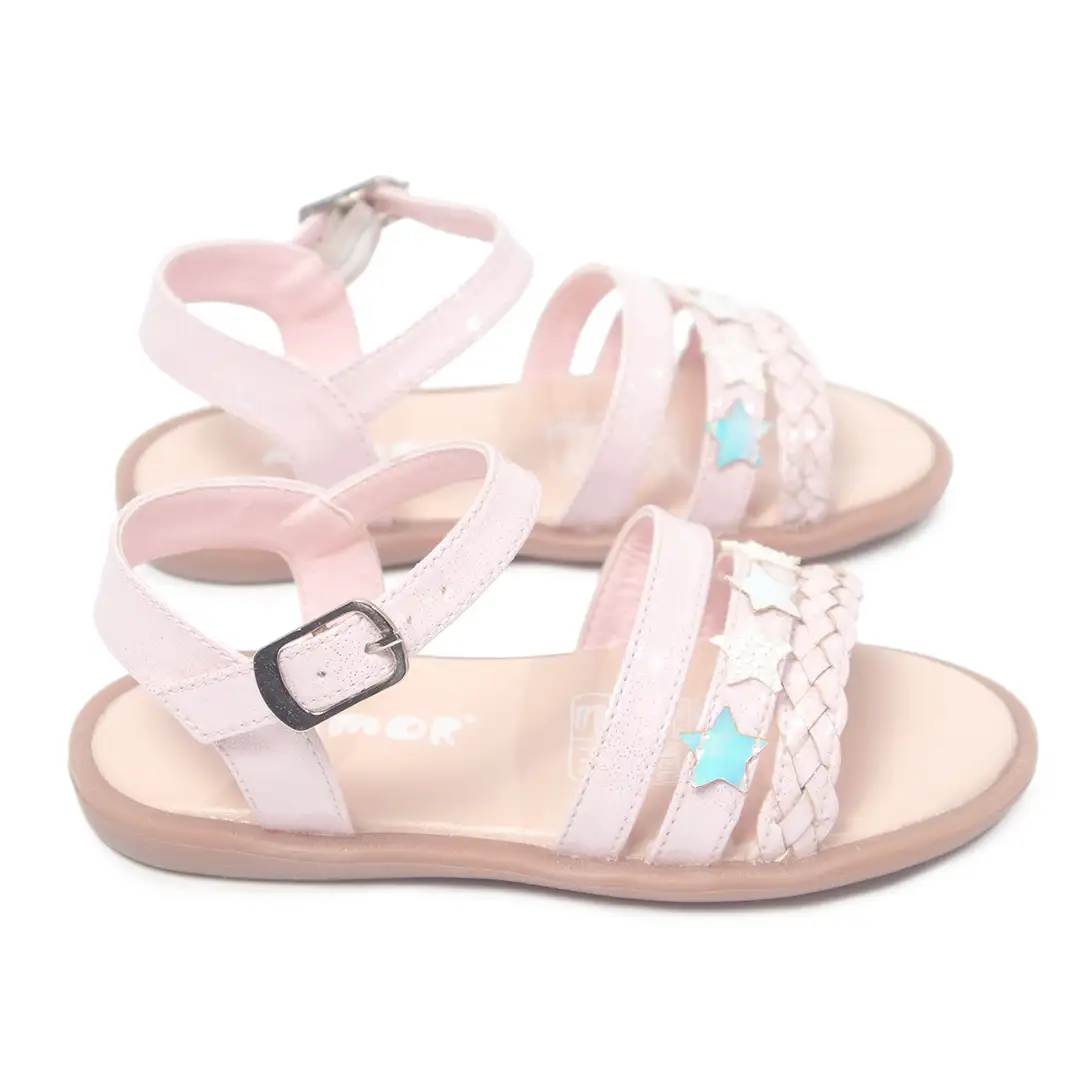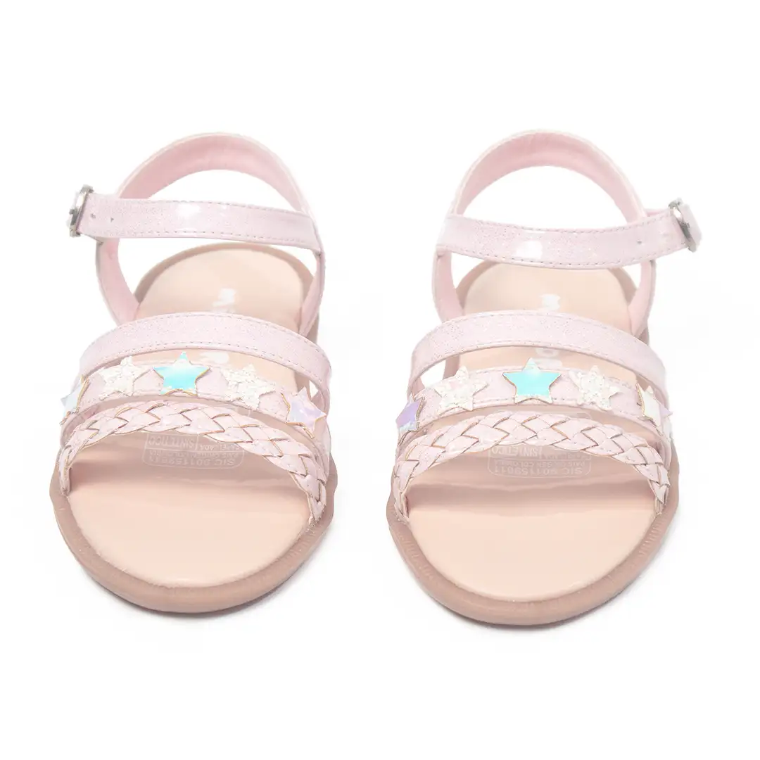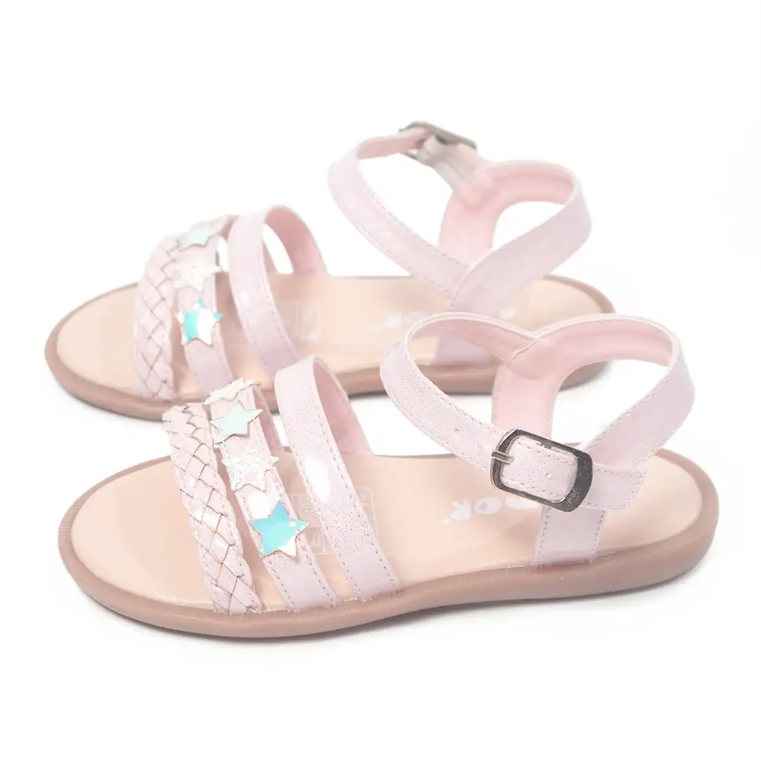 Un diseño elegante y funcional que incorpora tiras paralelas en texturas trenzadas y lisas, complementadas con estrellas decorativas en acabados tornasol. La base de suela plana proporciona estabilidad, mientras que la correa ajustable asegura un calce perfecto, convirtiéndolas en una opción versátil y cómoda.