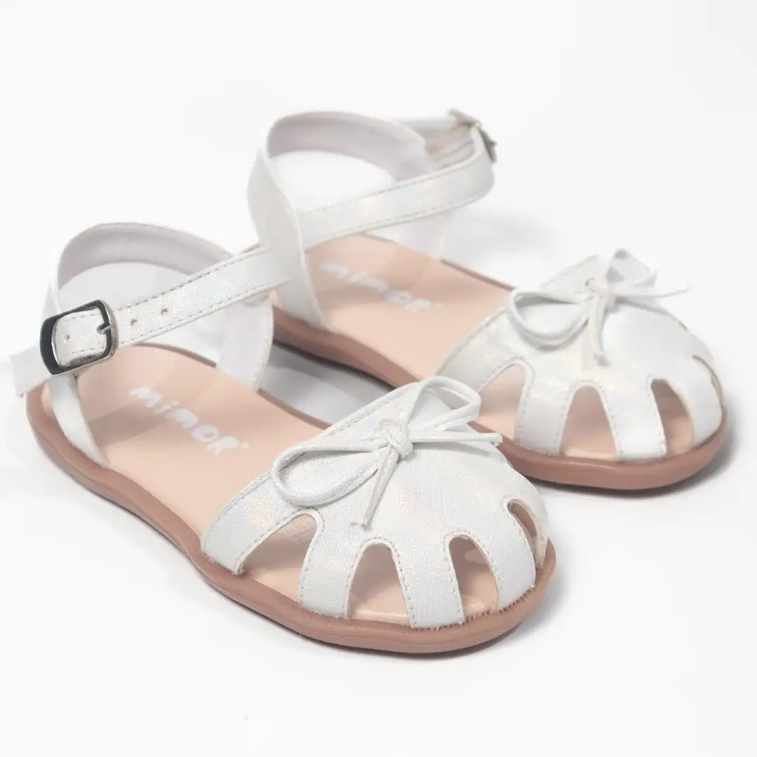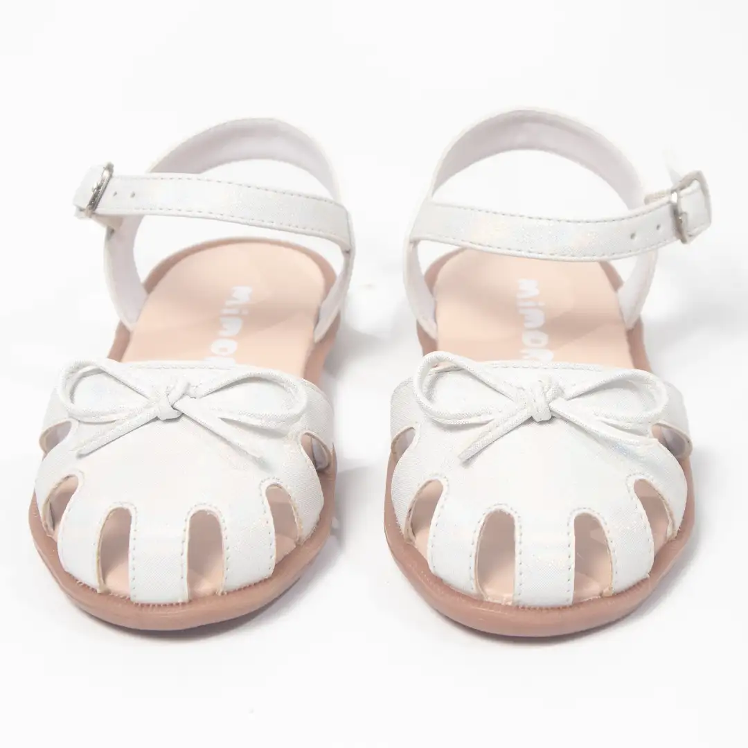 Sandalias para niña en color blanco con un diseño clásico que resalta por sus formas geométricas y detalles delicados. La parte frontal cerrada incluye cortes simétricos en forma de arco, creando un patrón curvo que combina estilo y ventilación. Un lazo decorativo en el centro añade un toque femenino y sutil. La suela plana con bordes redondeados está elaborada en goma flexible en tono natural, ofreciendo comodidad y estabilidad en cada paso. La correa ajustable, de diseño curvado, rodea el tobillo y se asegura con una hebilla metálica, proporcionando un ajuste seguro y práctico.