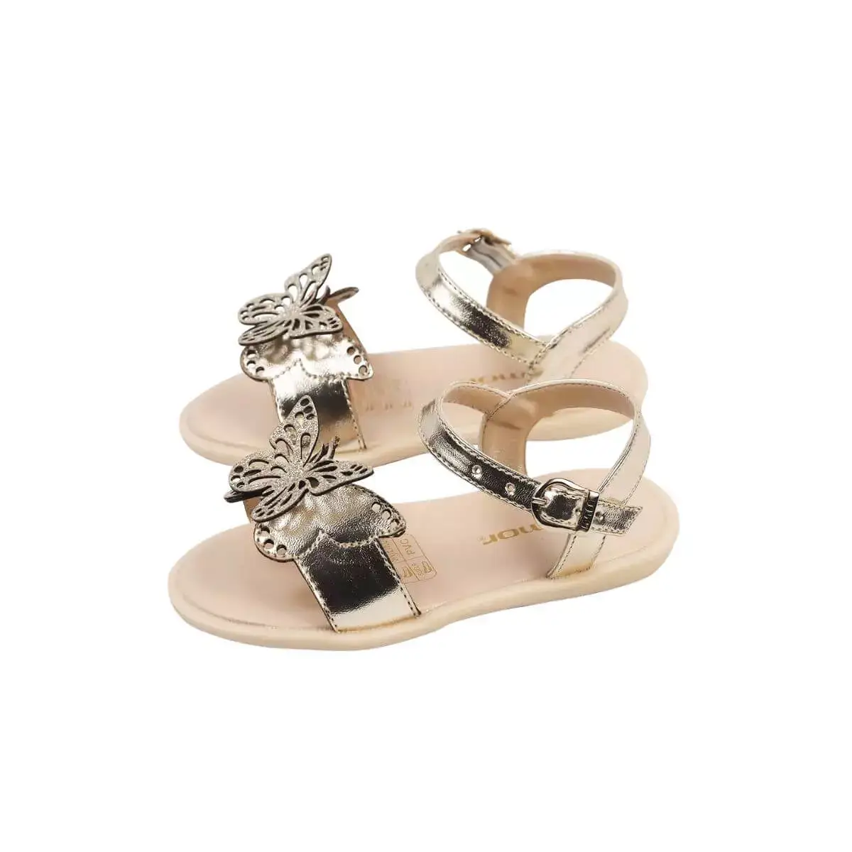 Tabla que muestra las medidas para las diferentes tallas de la suela infantil Sandalias para niña en color champaña con un diseño destacado por sus detalles geométricos y ornamentales. En la parte central, presentan un aplique de mariposa recortada con patrones calados simétricos, que añaden un elemento decorativo llamativo y tridimensional. La tira frontal en acabado metálico se conecta con una plantilla acolchada en tono natural, diseñada para brindar confort. La suela plana, de contorno ovalado y hecha de goma flexible, garantiza estabilidad al caminar. La correa ajustable con hebilla metálica en el tobillo asegura un ajuste firme y funcional, manteniendo un diseño elegante y práctico.