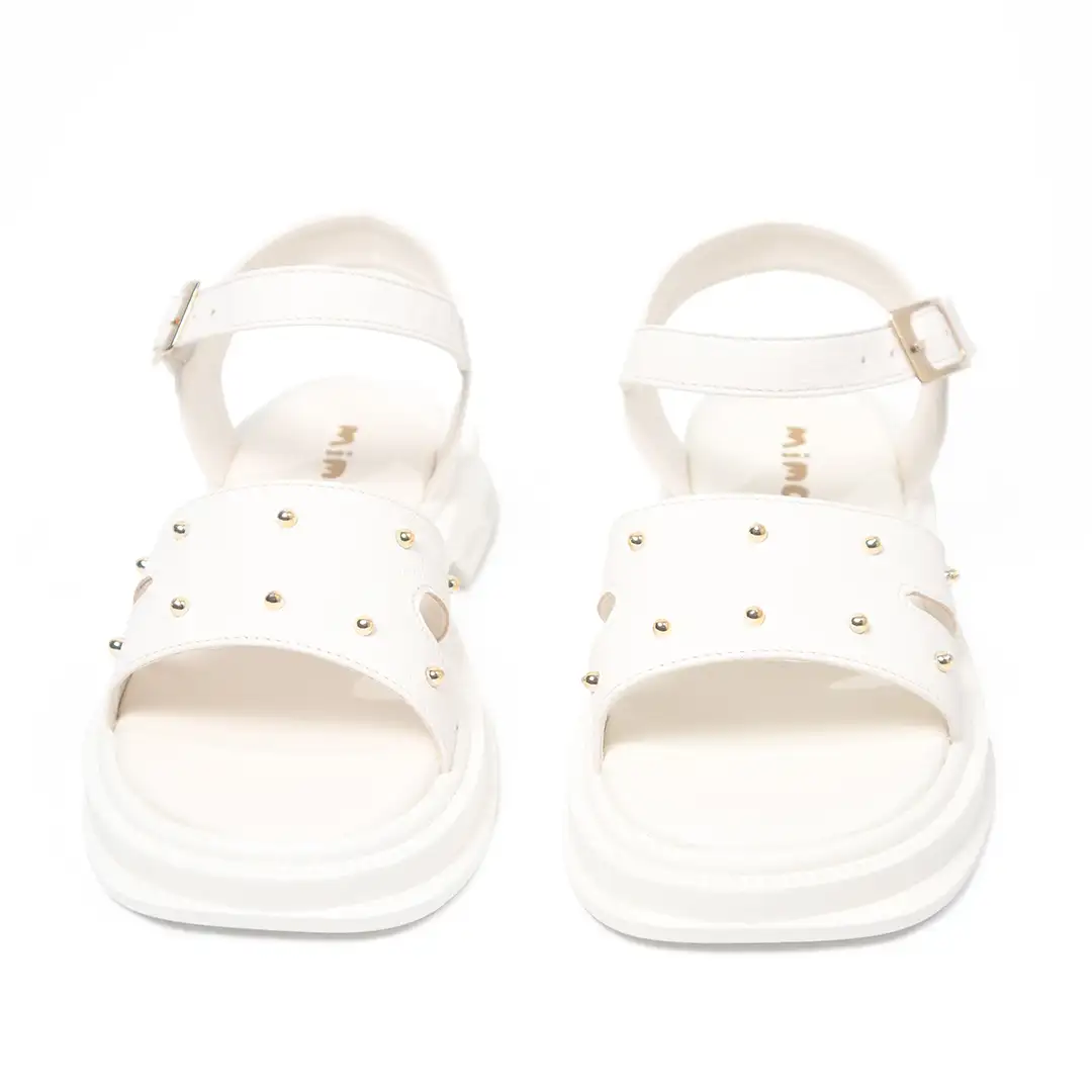 Sandalias tipo tacón pequeño en color talco, diseñadas para destacar por su combinación de elegancia y modernidad. Presentan una banda ancha decorada con remaches dorados pequeños distribuidos uniformemente, que aportan un toque sofisticado y contemporáneo. La estructura incluye una correa ajustable al tobillo con hebilla metálica en tono plateado para un ajuste seguro y cómodo. La suela elevada tiene bordes redondeados y un diseño segmentado que proporciona estabilidad y amortiguación al caminar.