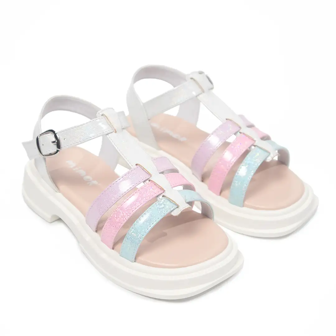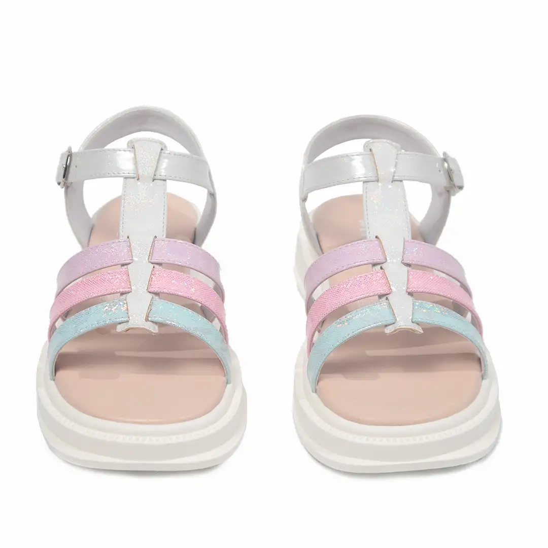 Este modelo cuenta con tiras horizontales en tonos pastel de rosa, lila y azul con acabado glitter, dispuestas de manera simétrica para un diseño atractivo y vibrante. La correa superior en blanco brillante incluye una hebilla metálica ajustable para un ajuste cómodo y seguro. La suela gruesa de plataforma en color blanco proporciona soporte y amortiguación adicional, ideal para uso prolongado. Perfectas para añadir un toque de color y brillo a cualquier atuendo casual o de ocasión especial.