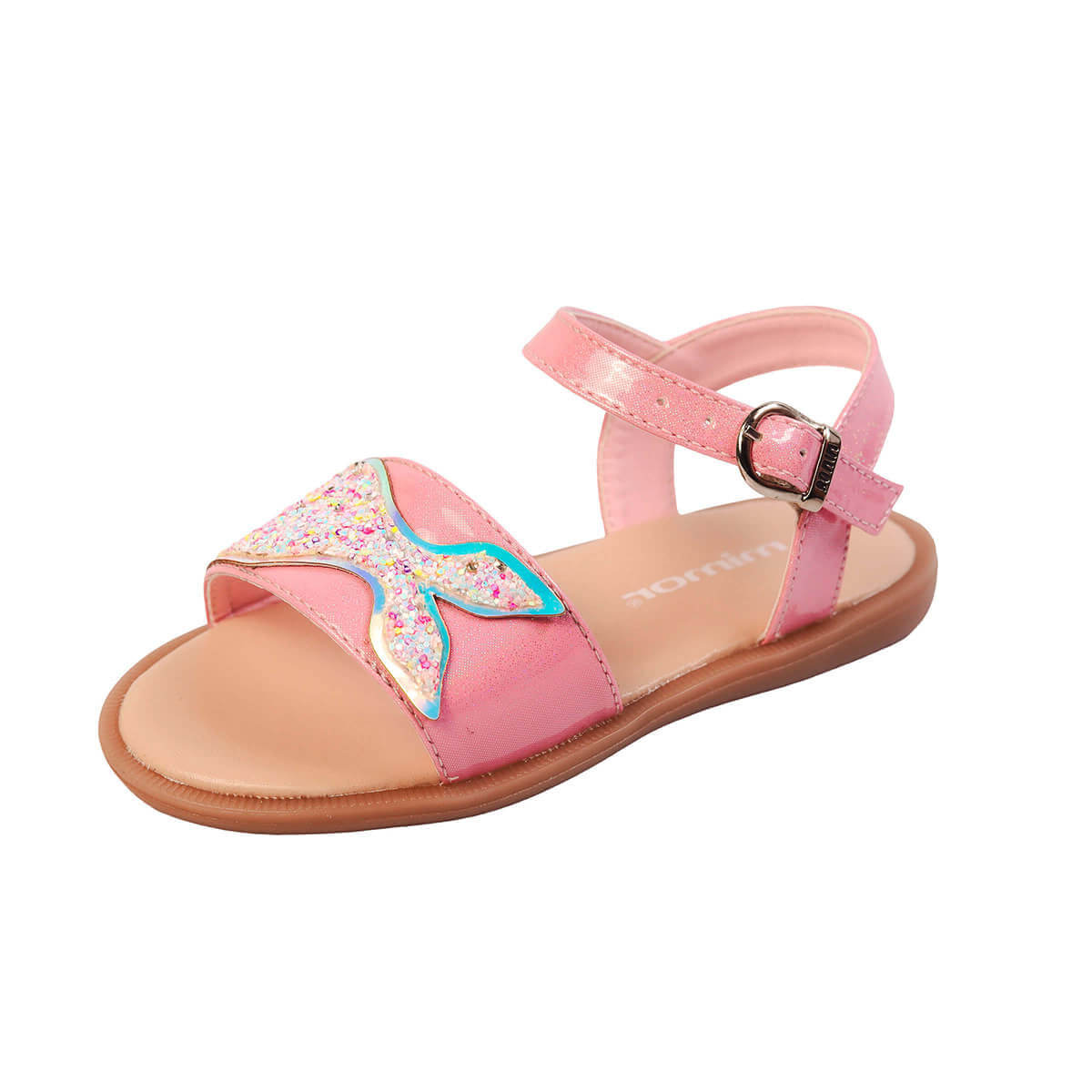 Estas sandalias rosadas capturan un estilo divertido y encantador con un diseño que incluye una decoración de cola de sirena en acabado iridiscente con detalles de glitter multicolor
